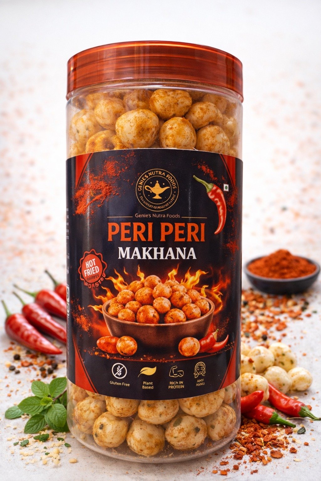 Peri Peri Makhana is a roasted snack made from premium lotus seeds, seasoned with bold peri peri spices including chilli and herbs. It delivers a spicy, tangy, and flavour-packed crunch, making it a perfect choice for those who enjoy a fiery snacking experience. Carefully prepared with selected ingredients, it offers a lighter and healthier alternative to fried snacks.